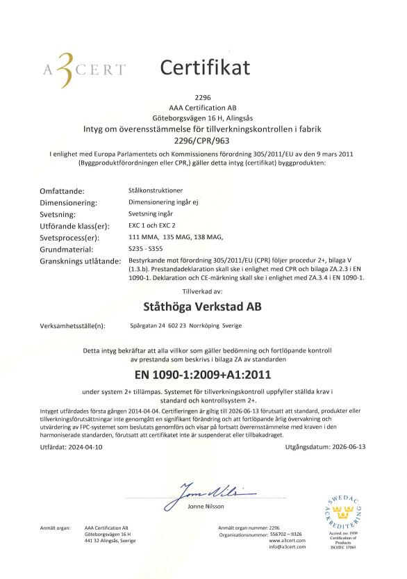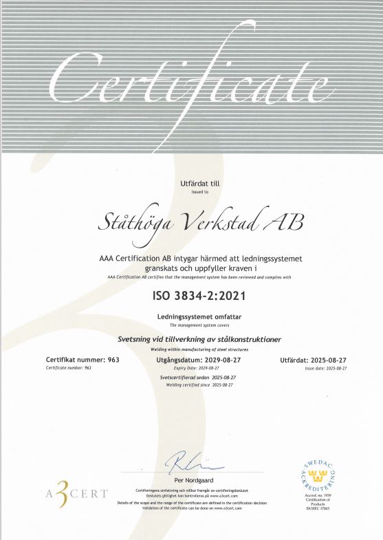Ståthöga Verkstad AB grundades 1981, vi är ca 40 anställda och har en verkstadsyta på 1800 m2 . Yrkeskunnig och erfaren personal är våra starkaste resurser tillsammans med vår höga servicegrad. Vi är certifierad enlig ISO 9001(kvalitet), ISO 14001 (miljö), SS-EN 1090-EXC 1 och EXC 2 (bärande stålkonstruktioner). ISO 3834 (Svetsning vild tillverkning av stålkonstruktioner)